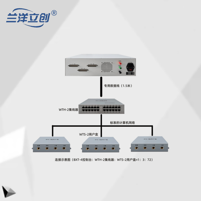 WTH-2集线器是根据用户需求,将BXT-4、BXT-3型综合练习控制台(DB50接口输出)输出端和用户盒有效物理连接,将控制台耳机、电键、二路、三路信号物理连接到用户盒。为方便布线和维护,本集线器采用标准的网线做法,大大的减少了布线和维护难度。
